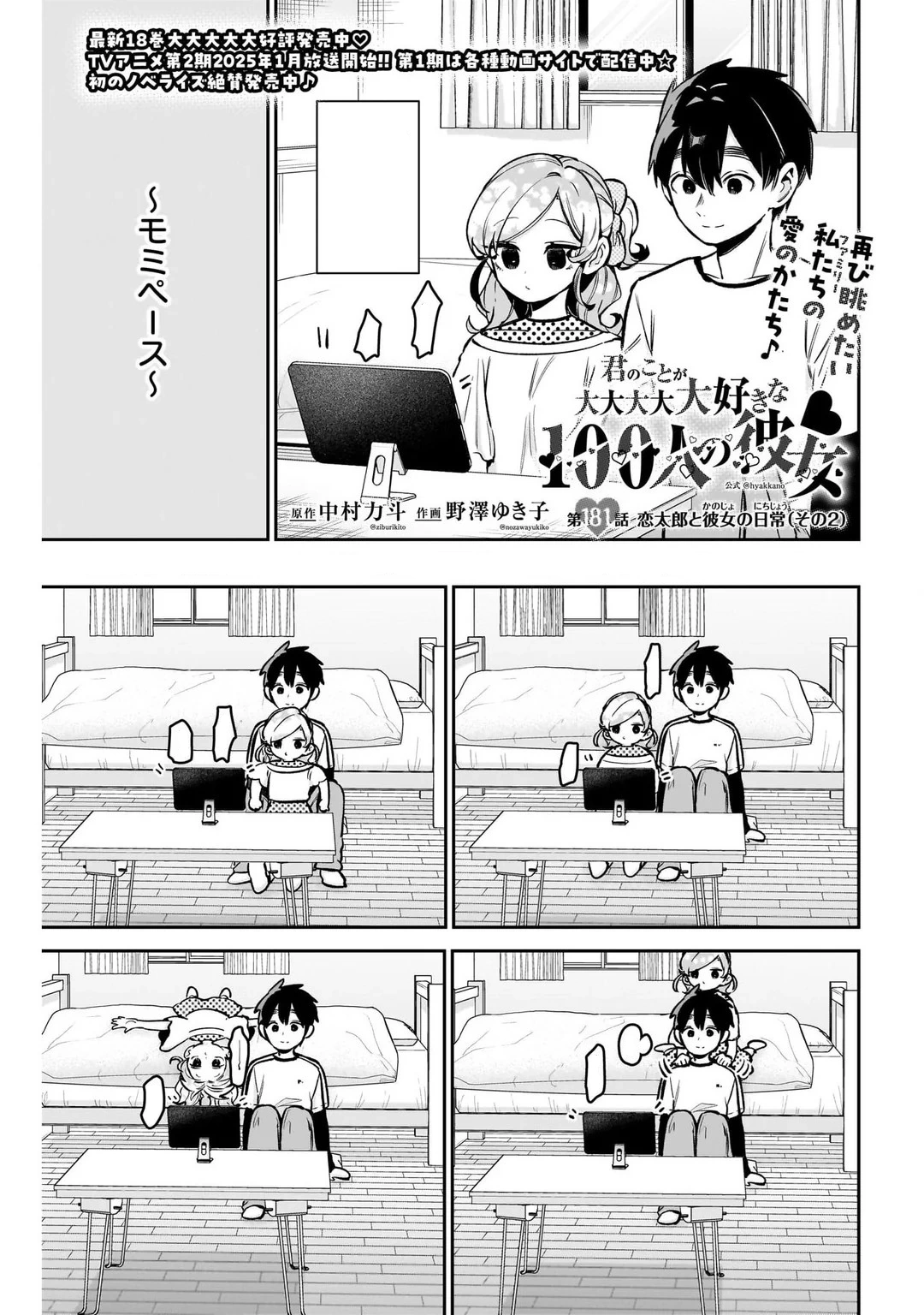 Rentarou and Mei are both described as selfless, thus when they go on a date, things happen. Rentarou states they're going to get donuts for lunch which makes Mei believe she's careless and goes along with it. However as they pass by an exhibition about their own anime, Mei states she wants to go there and Rentarou sees he was caught and goes along. The duo go back and forth presenting objects the other wants (Mei: a Hahari acrylic stand; Rentarou: a tote bag of the entire cast), with the narration stating it's more like a battle manga between the two of them.