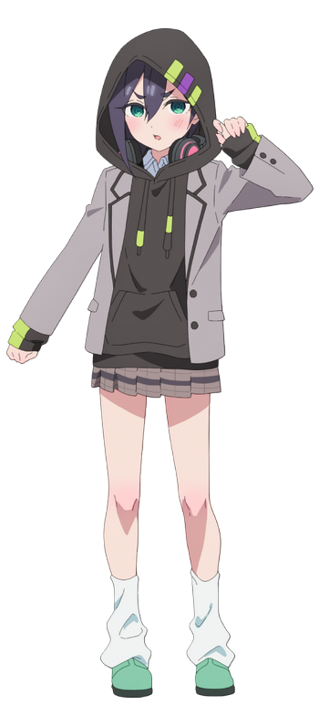 Kurumi wears the Ohananomitsu Middle School uniform with a few modifications. Her blazer is unbuttoned, and she doesn't wear a necktie. Over her blouse, she wears a black hoodie with green and purple highlights on the hood and sleeves.